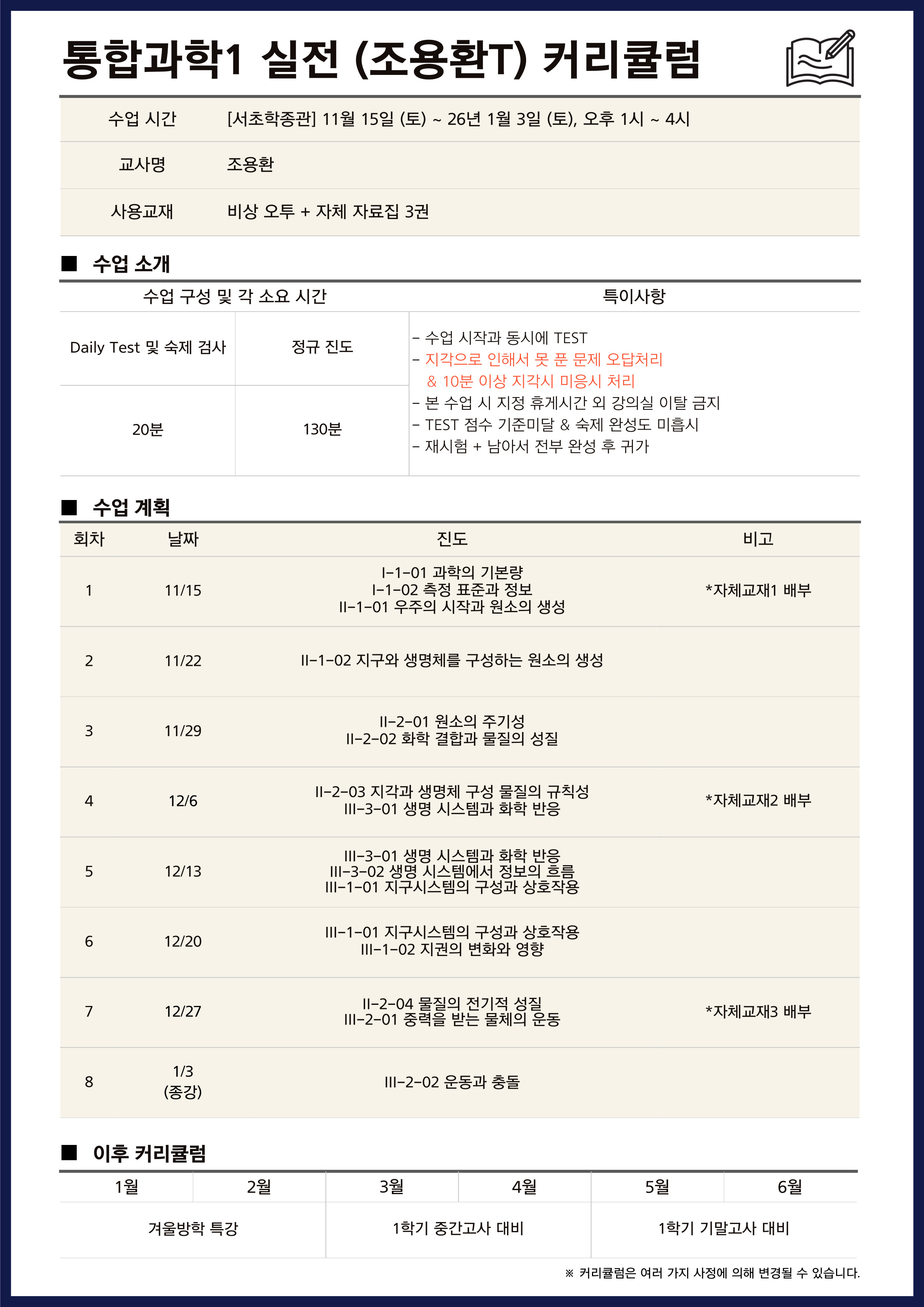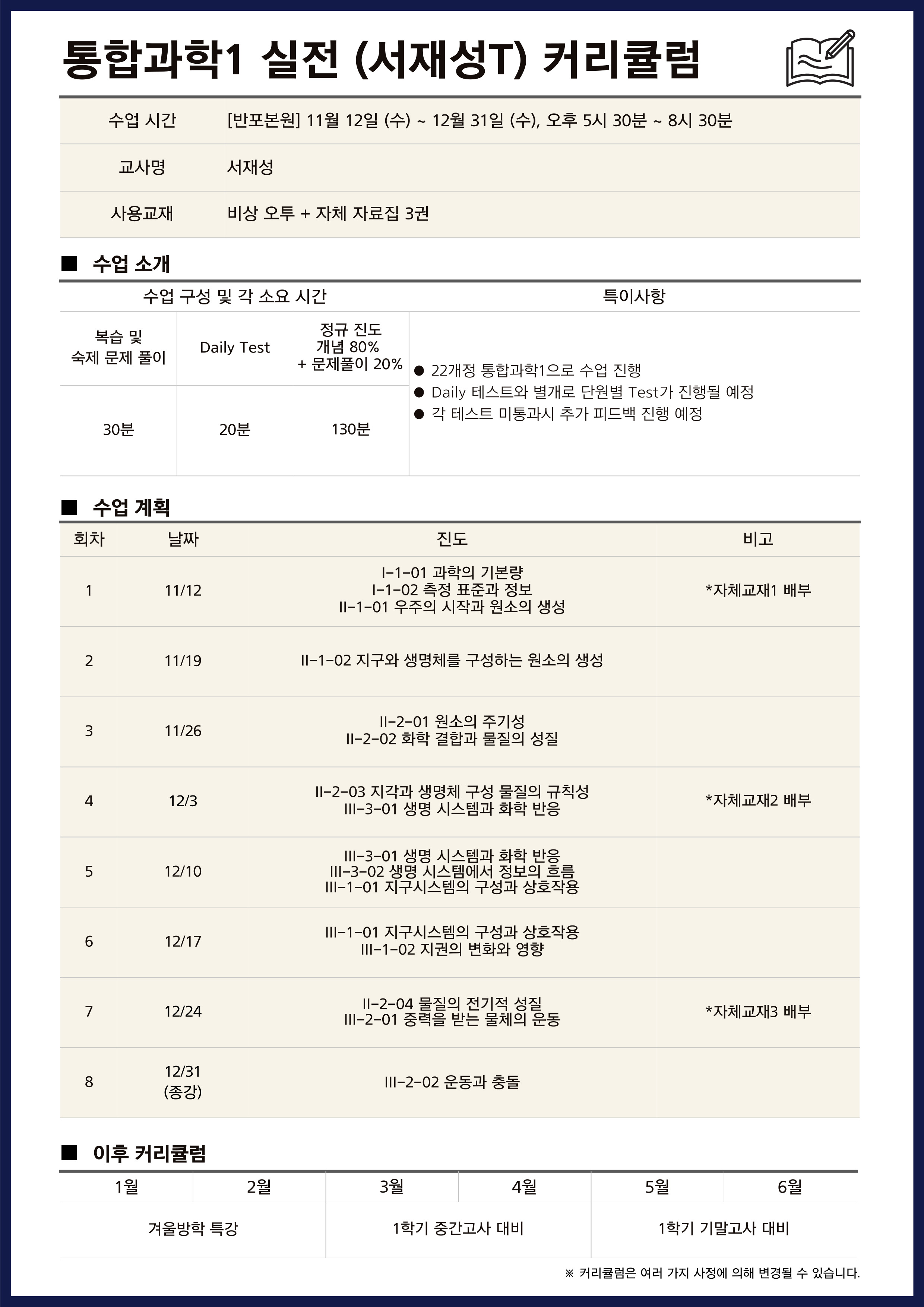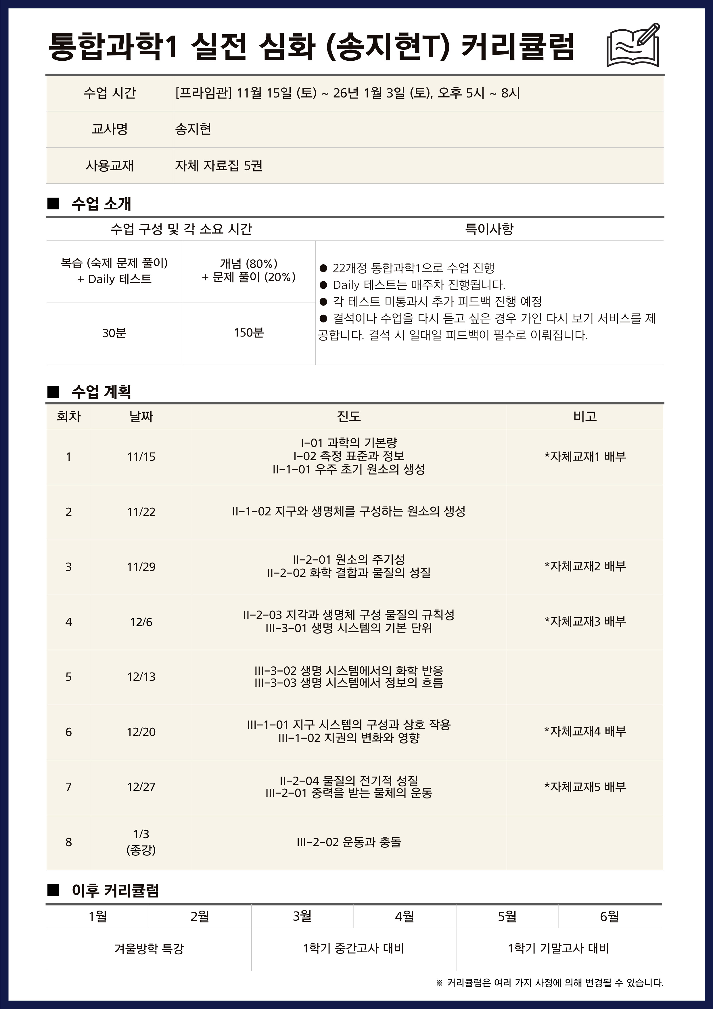 통합과학 실전 수업은 통합과학의 개념을 충실히 가르치고 기본 문항 문제풀이를 통해 개념을 문제에 적용하는 연습을 진행합니다.