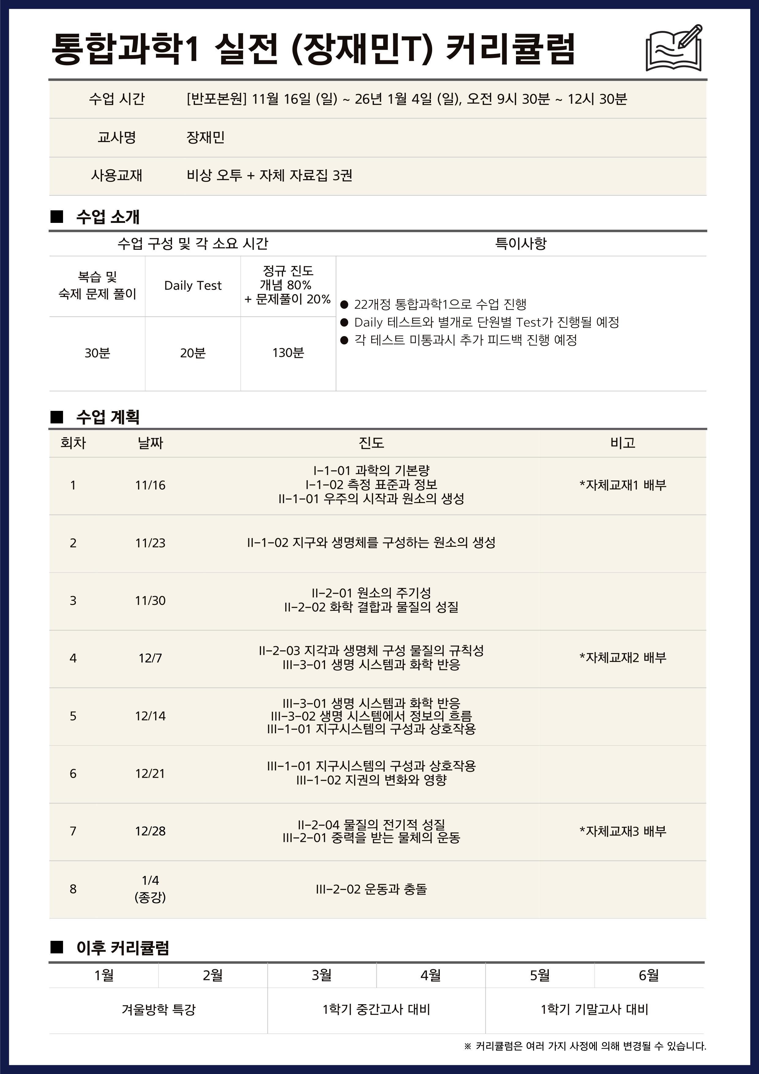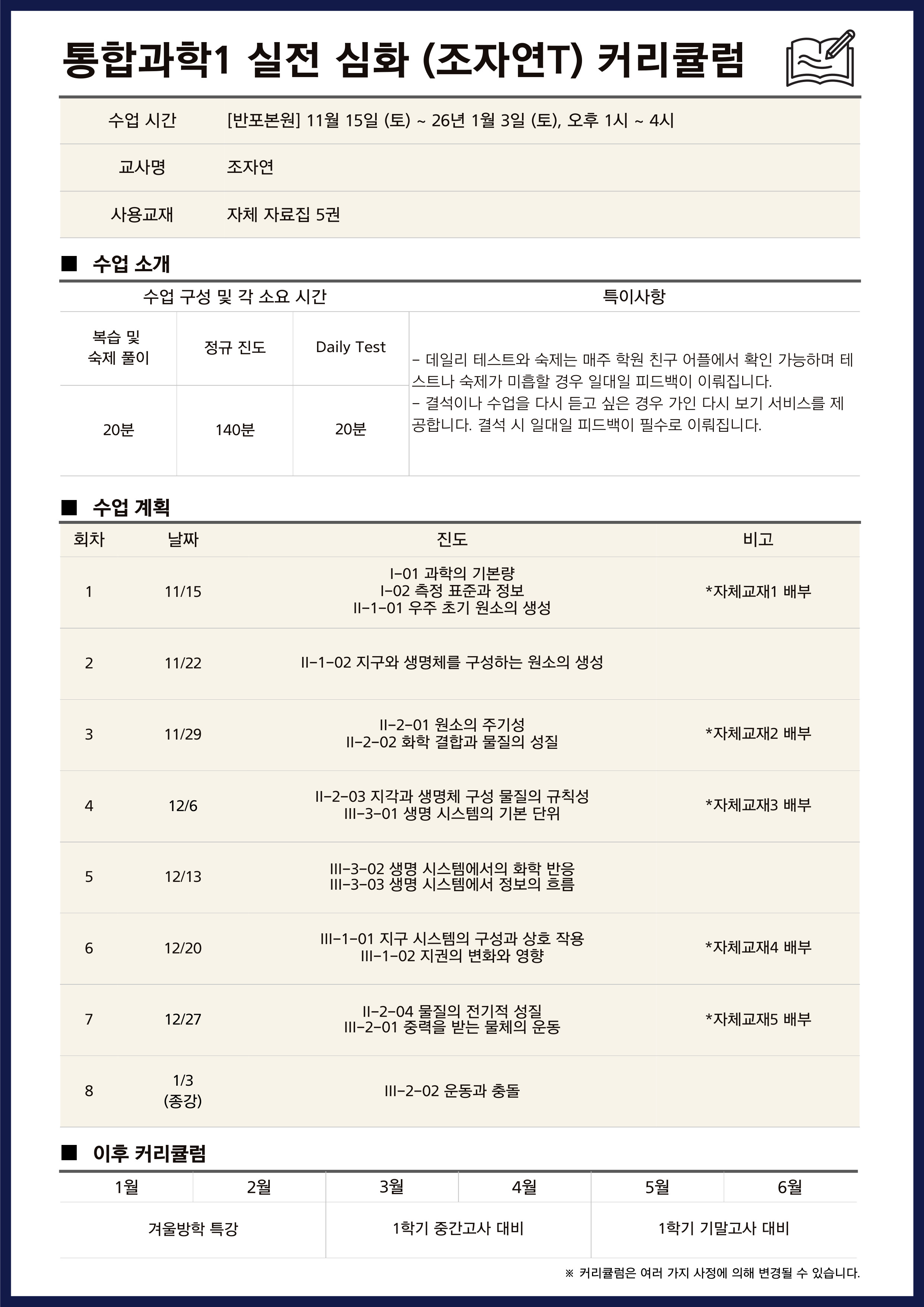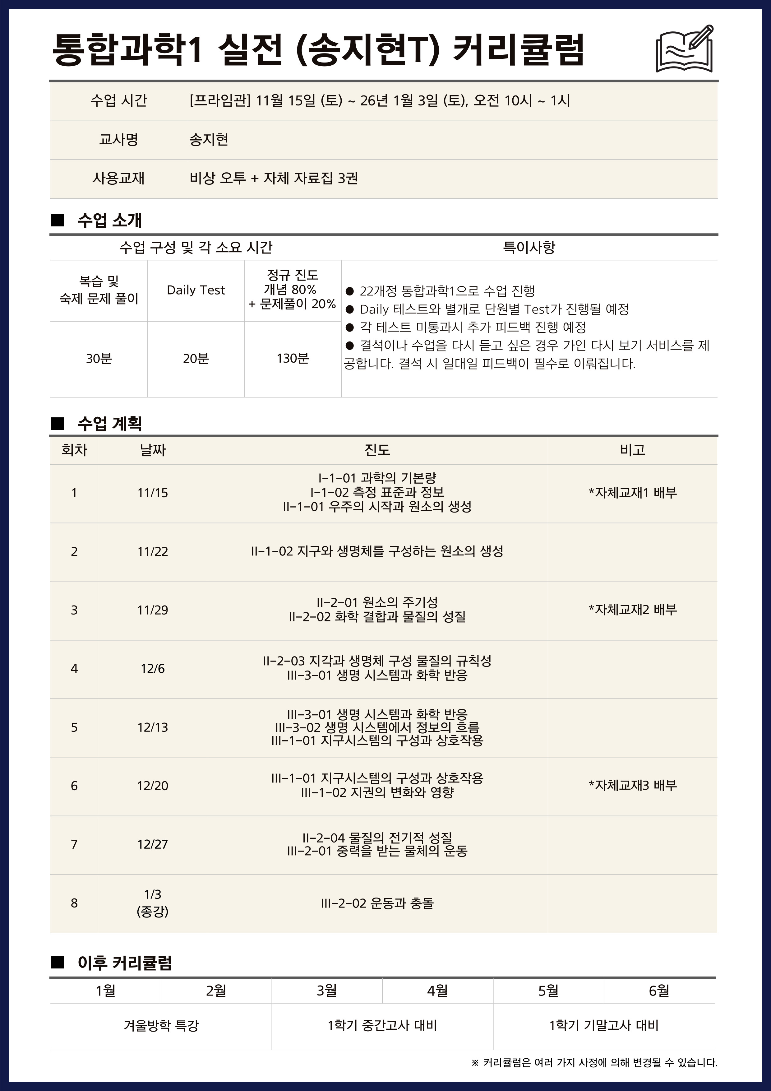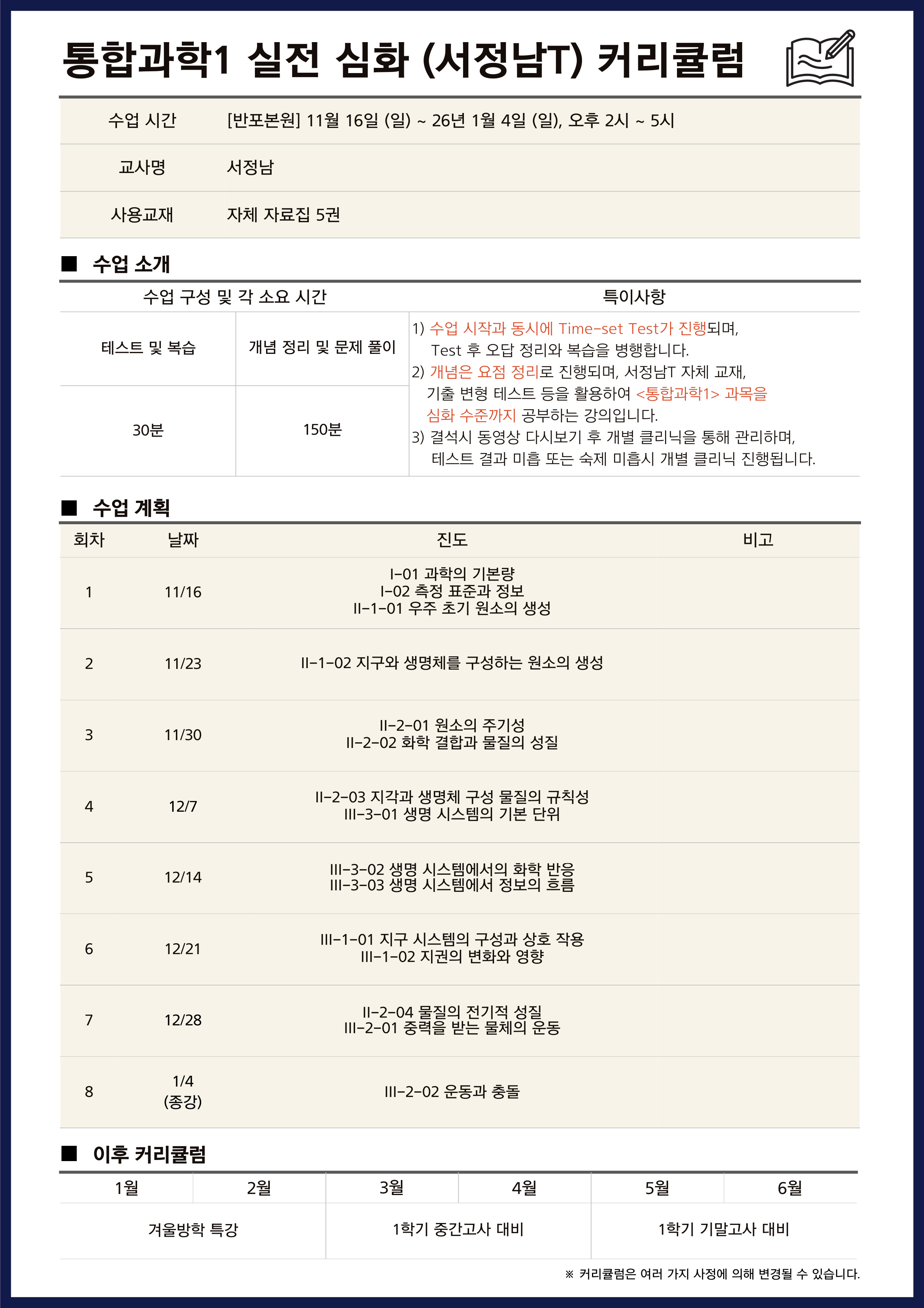 통합과학 실전 수업은 통합과학의 개념을 충실히 가르치고 기본 문항 문제풀이를 통해 개념을 문제에 적용하는 연습을 진행합니다.