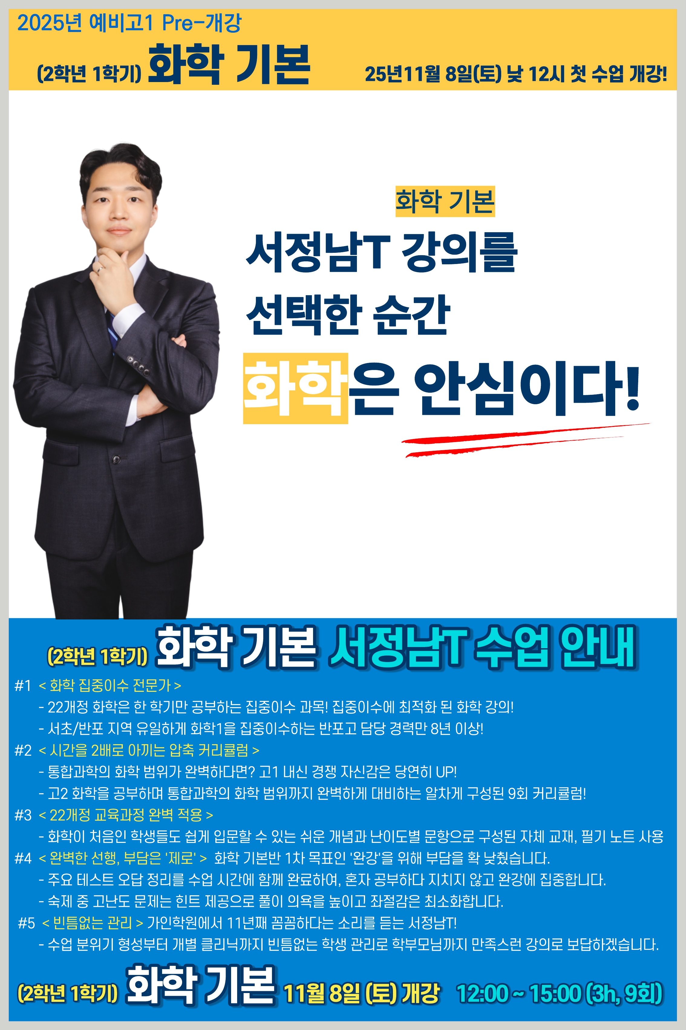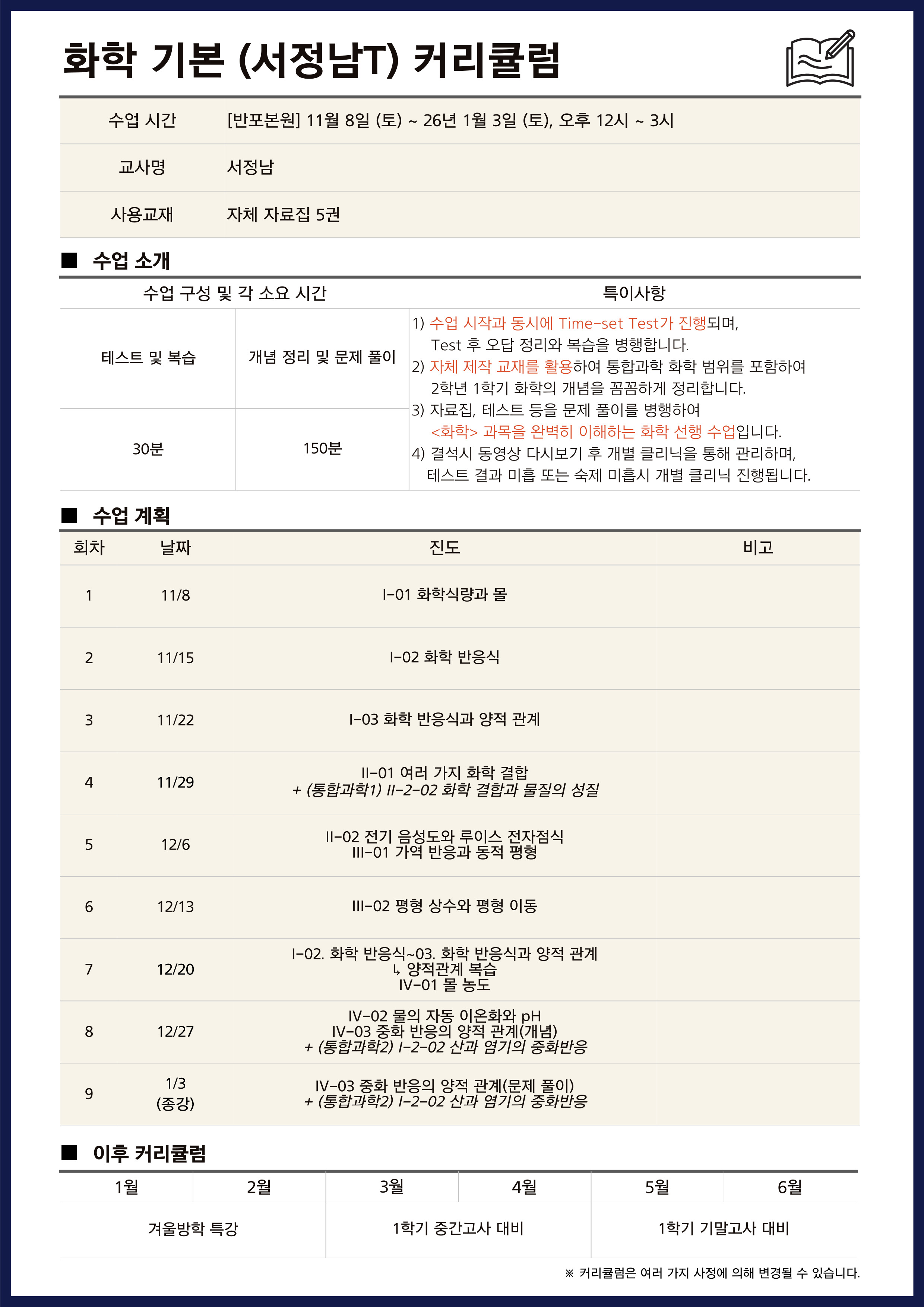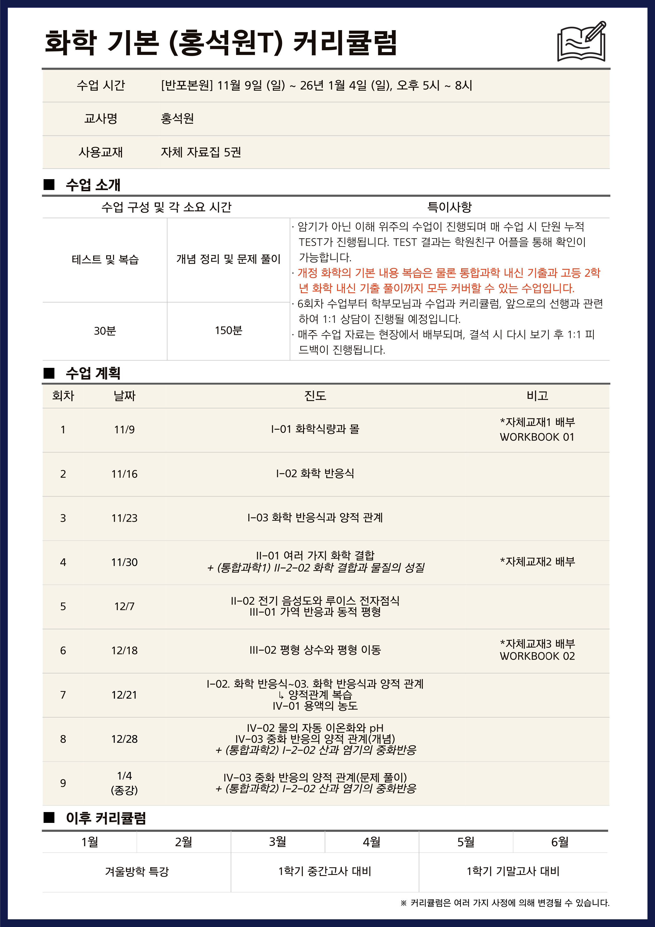 화학 기본은 통합과학부터 (일반선택)화학까지의 화학 개념을 충실히 가르치고 기본 문항 문제풀이를 통해 개념을 문제에 적용하는 연습을 진행합니다.