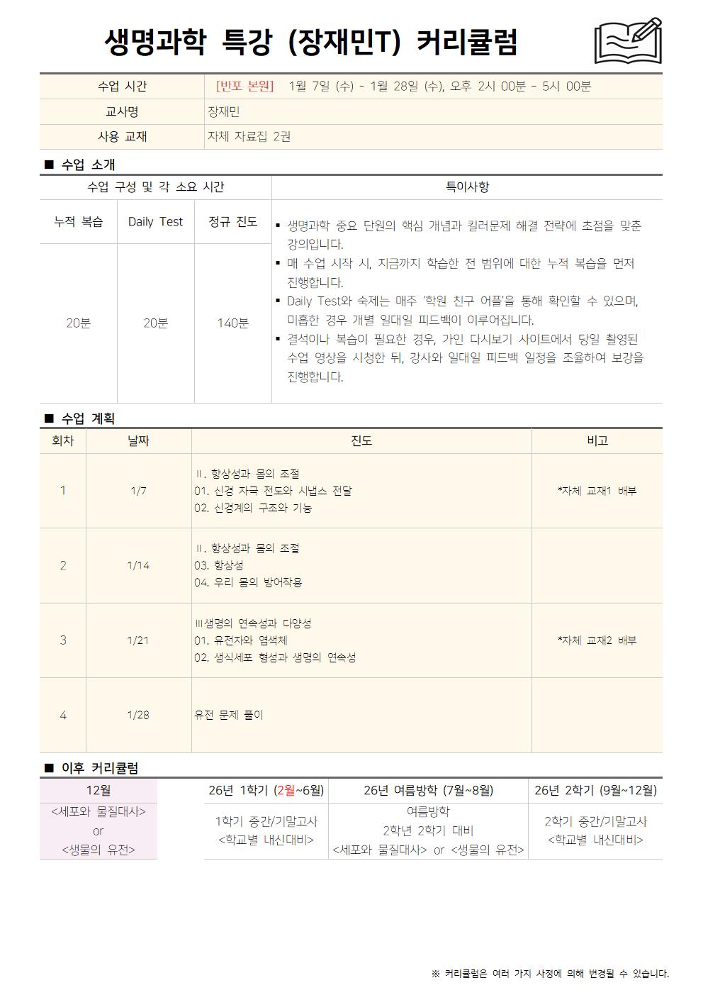 2026 예비고2 겨울방학 생명과학 1월 특강