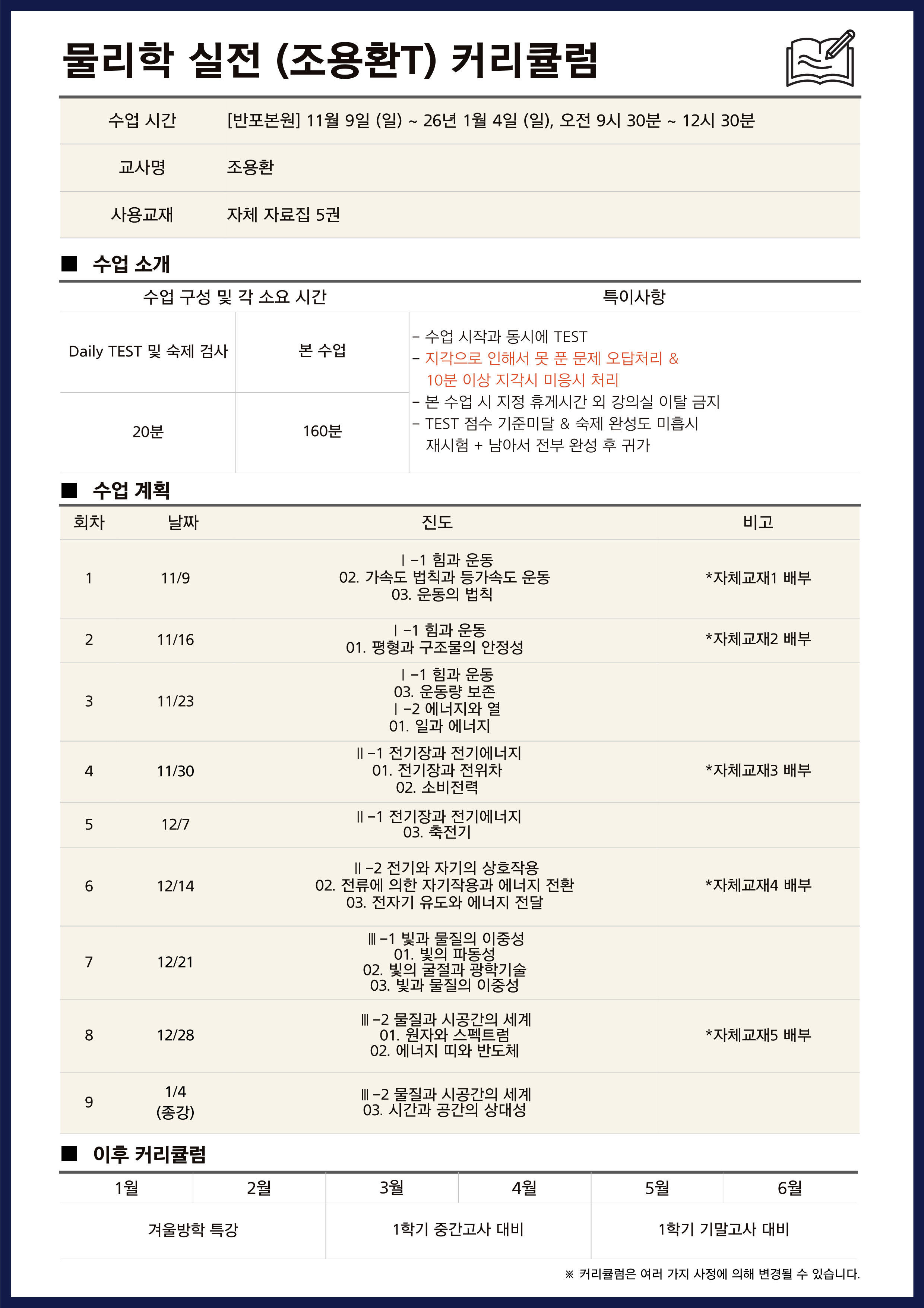 심화 개념, 각 개념을 적용하는 기본, 심화 문항을 다루는 개정 물리학에 완전히 집중된 수업입니다.